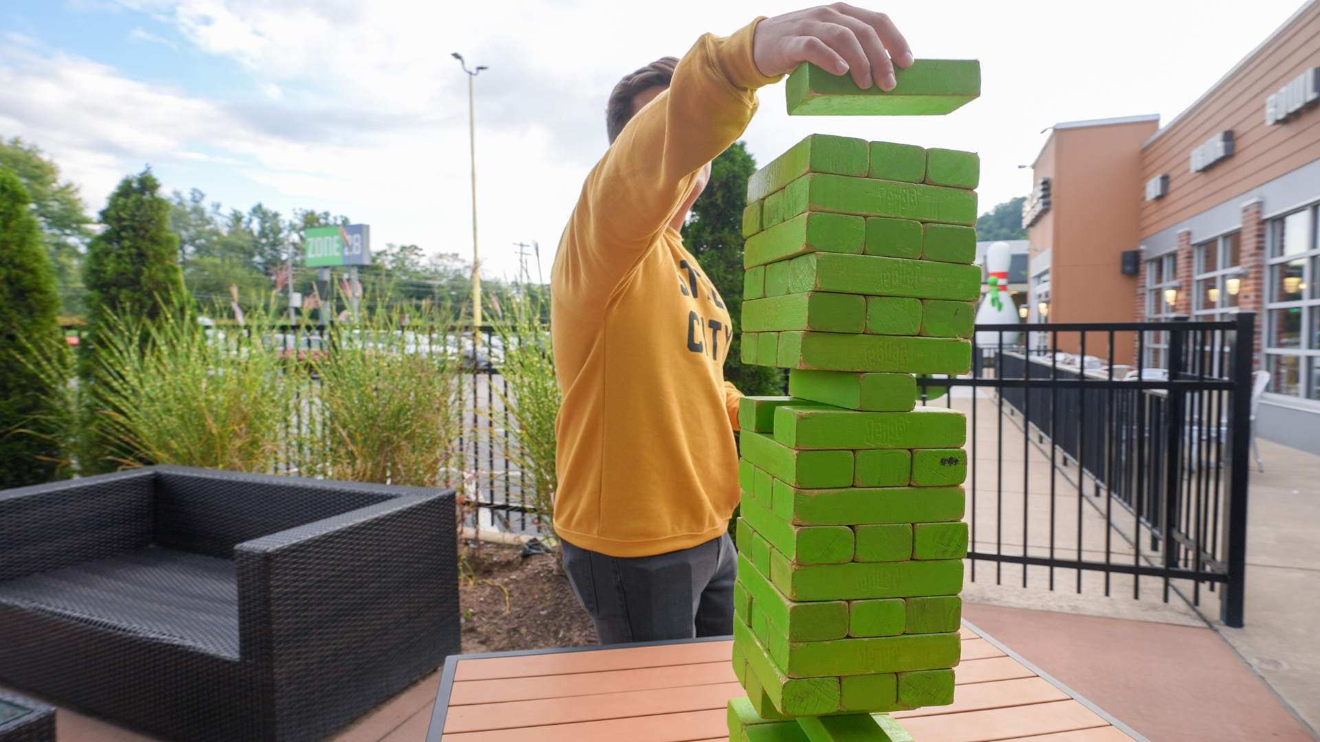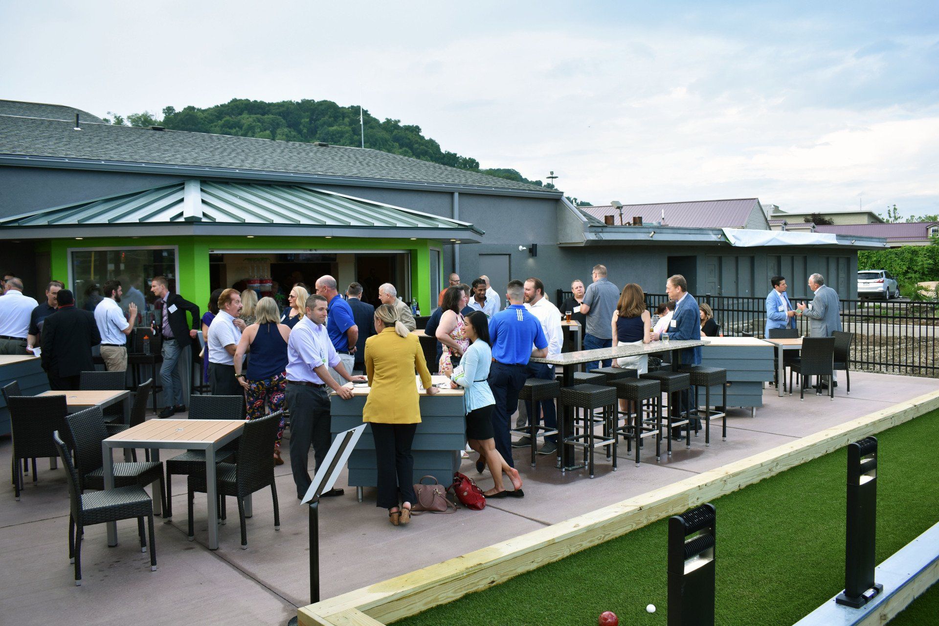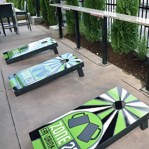 Bring your friends, kick back with a beverage, and soak up the atmosphere. Featuring a massive, 15’ television, an outdoor bar, 3,500 sq.’ patio area, miniature dog park, corn hole court, bocce court, and giant Jenga, what more could you ask for?