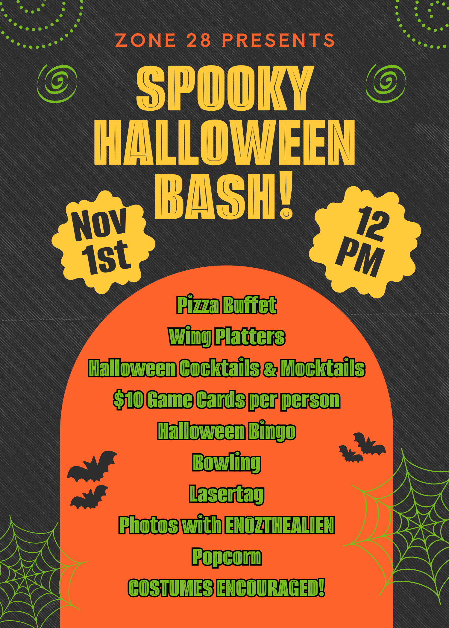 Halloween isn’t over just because October 31st passed—at Zone 28, we’re keeping the party alive with our Spooky Halloween Bash on Friday, November 1st at 12 PM!